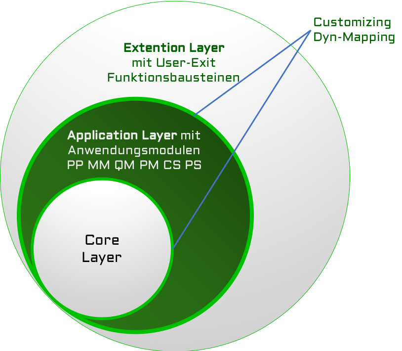 Jeder Layer setzt jeweils auf den „inneren“ Layern auf. Während der Core-Layer mit seinem zugehörigen Customizing-Layer unteilbar ist und bei jeder Installation komplett ausgeliefert und über den Customizing-Layer eingerichtet wird, werden die folgenden Layer jeweils modulweise ausgeliefert und customized.